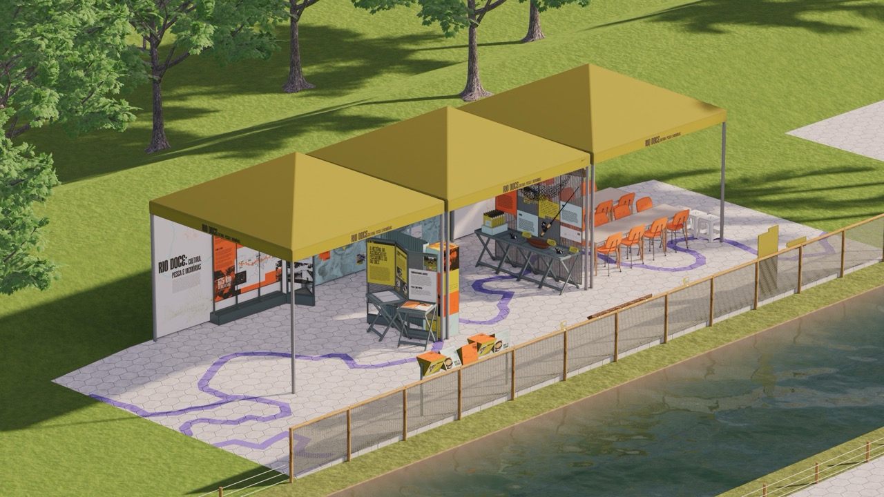 Seguindo a mesma lógica de flexibilidade, os mobiliários expográficos também são modulares e desmontáveis, permitindo que a exposição seja reorganizada ou transferida para outros espaços. O percurso expositivo inicia com o módulo do Museu do Território Atingido (MTA), apresentando seus conceitos, abrangência territorial e a relação da APESC com o museu. Em seguida, as atividades já desenvolvidas pela associação são exibidas em biombos e mesas dobráveis. Aproveitando o material das barracas, conteúdos como mapas, modos de fazer e narrativas sobre saberes tradicionais podem ser impressos e integrados às estruturas, compondo o fundo expositivo e exercendo também uma função educativa.