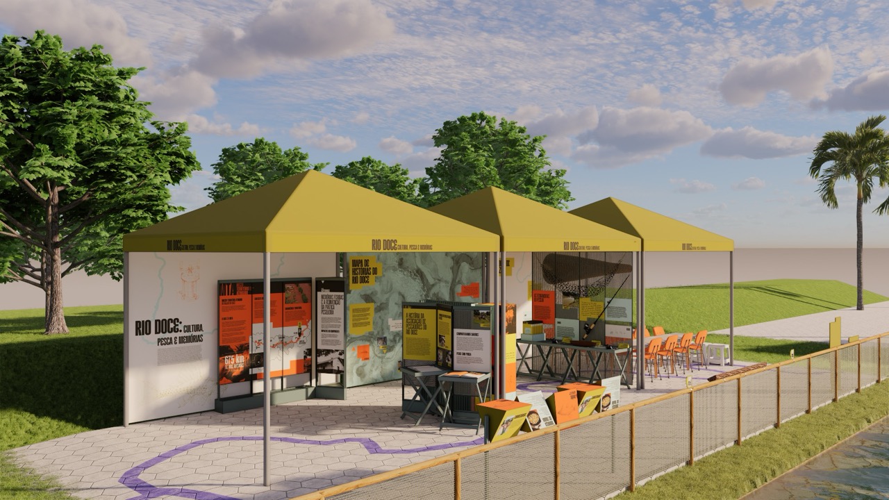 Os cubos de madeira recebem grafismos, ilustrações e frases de pescadores, enquanto o mapa dobrável apresenta um diagrama dos ambientes do rio, como rebojo, remanso, corredeira e conteúdos como as fases da lua e outras características relevantes para o universo da pesca. Diversos objetos de pesca são expostos nos biombos e mesas, enriquecendo a ambientação e introduzindo os visitantes ao universo simbólico e prático da pesca artesanal. Além disso, uma caixa de fichas reúne informações sobre espécies nativas e exóticas do Rio Doce, apresentando curiosidades e detalhes de cada uma.